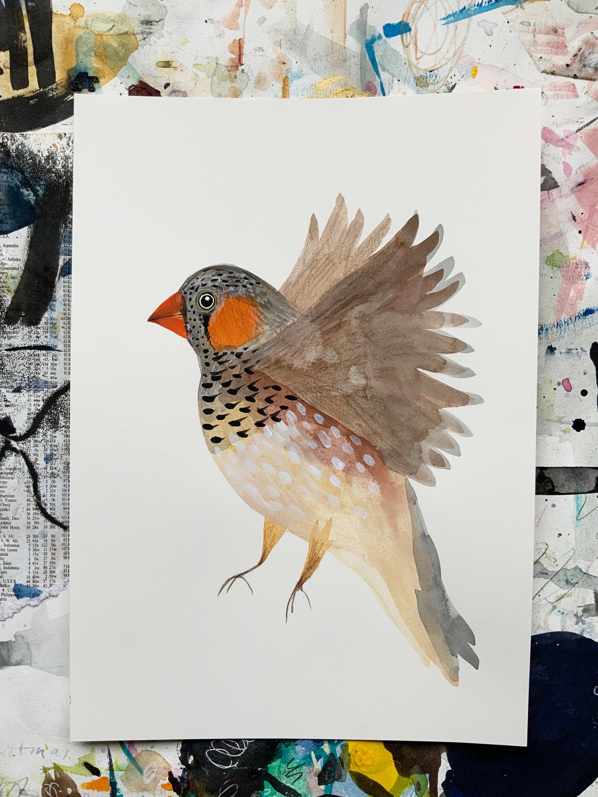 Original watercolour and gouache painting of an Australian Zebra Finch. Painted on 300gsm Arches watercolour paper. Size: 21.0 x 29.7cm artwork is unframed. This artwork is an original painting and will not be reproduced as a print.